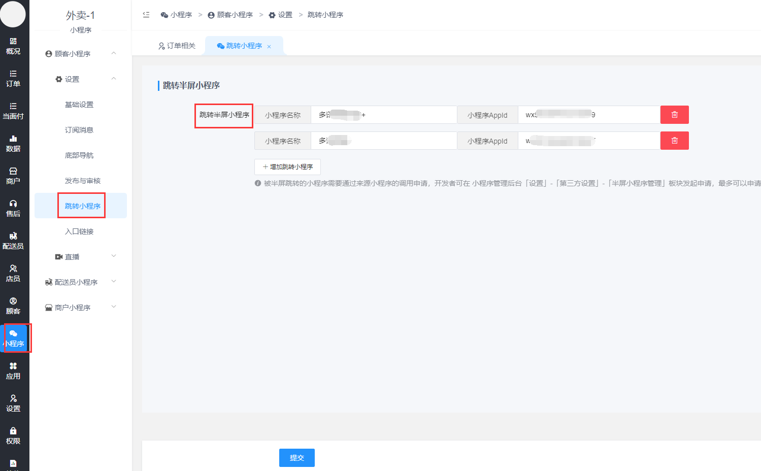 小程序-顾客小程序-跳转小程序,,增加跳转小程序,设置小程序名称和appid