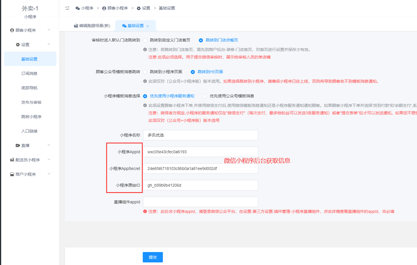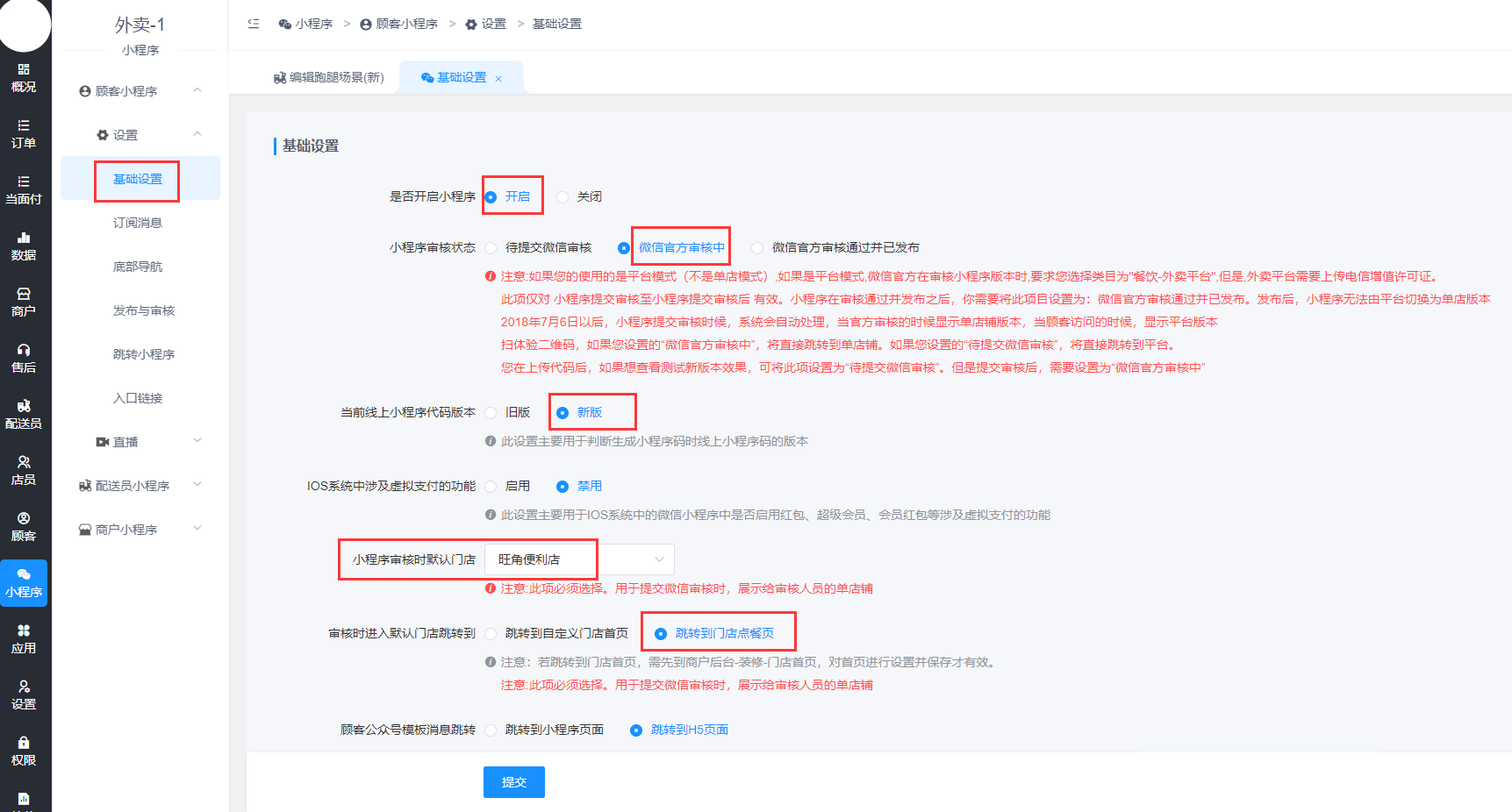 >[danger]注意: 没有资质的话,小程序审核状态选择微信官方审核中,小程序审核时默认门店选择文具便利店,跳转到门店点餐页