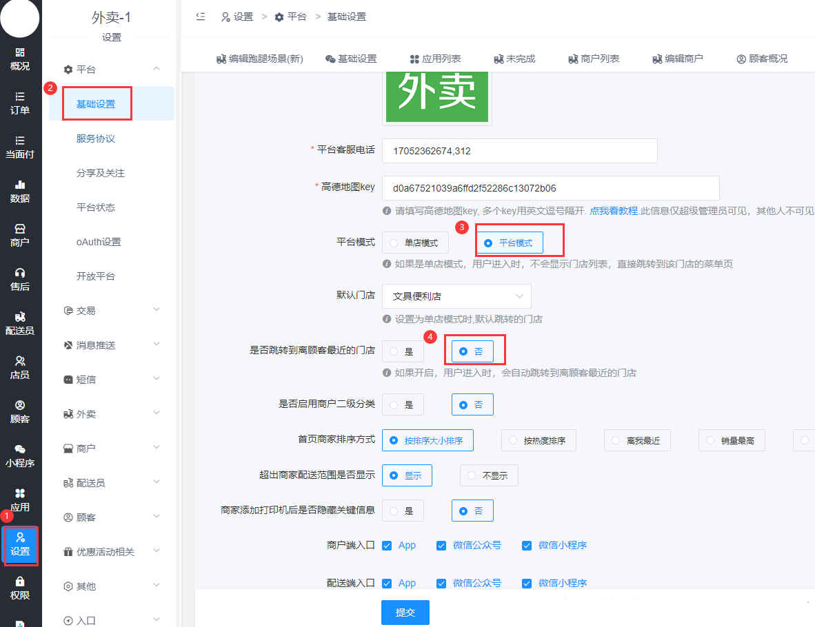 若设置后还不是单店模式,检查总后台设置-基础设置,设为平台模式,且不要跳转到离顾客最近门店