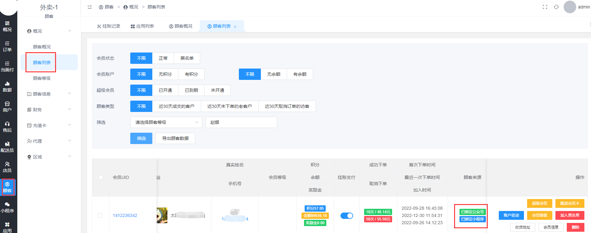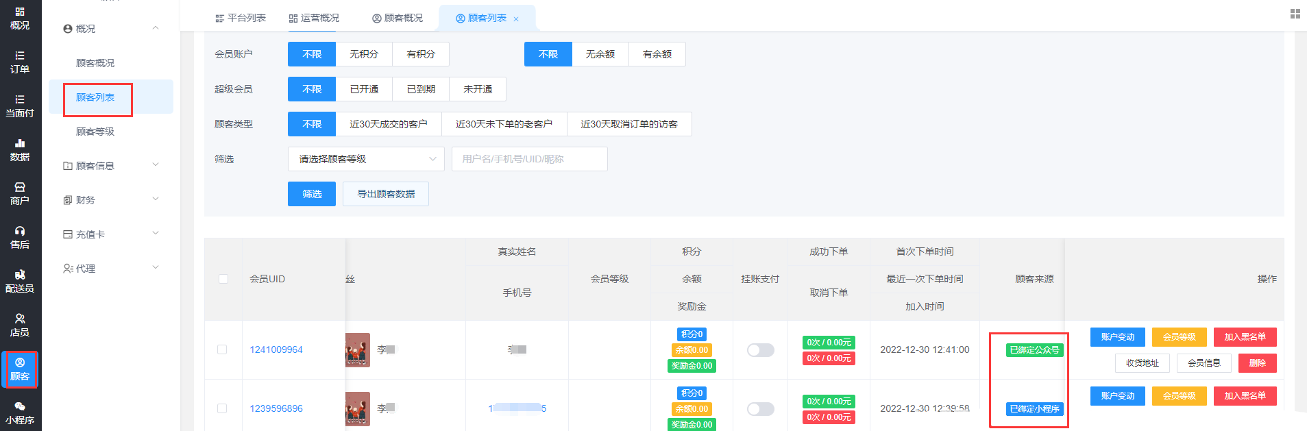(3).对应在顾客列表查看,搜索顾客呢称,显示一条数据已绑定公众号和小程序,即可。