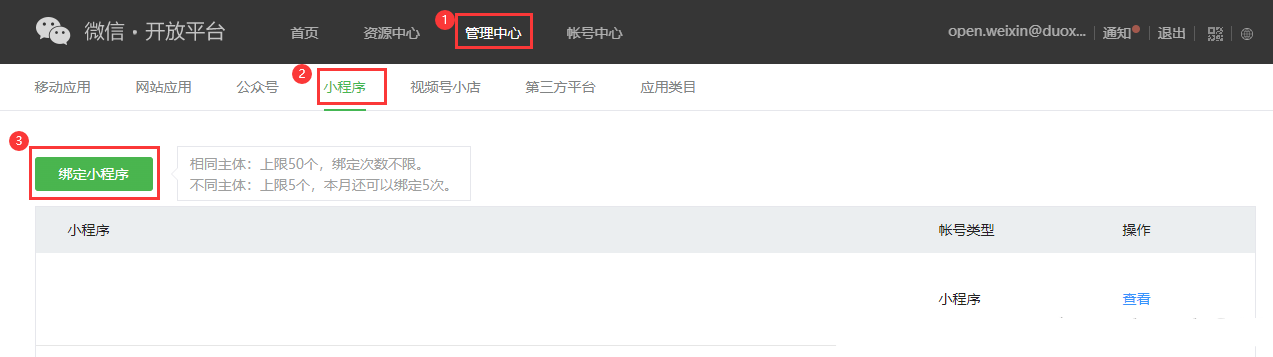 ## **1.2绑定小程序**