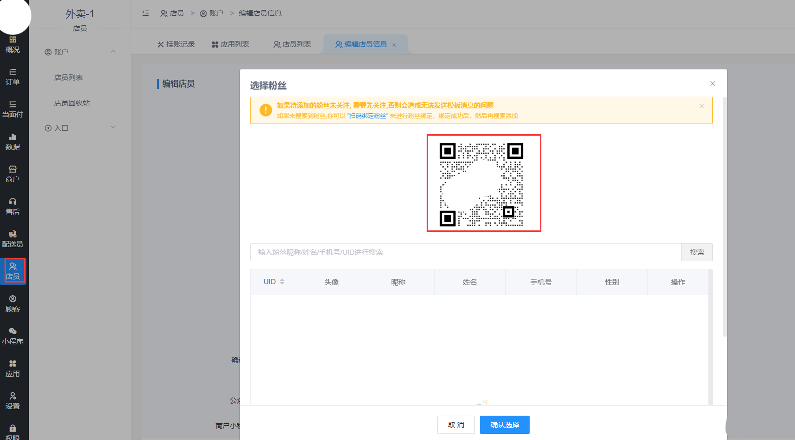 (2).进入后台店员-店员列表-添加店员,选择粉丝
