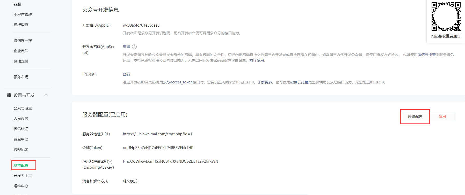 登录[微信公众平台公众号账号](https://mp.weixin.qq.com/),点击设置与开发-基本配置