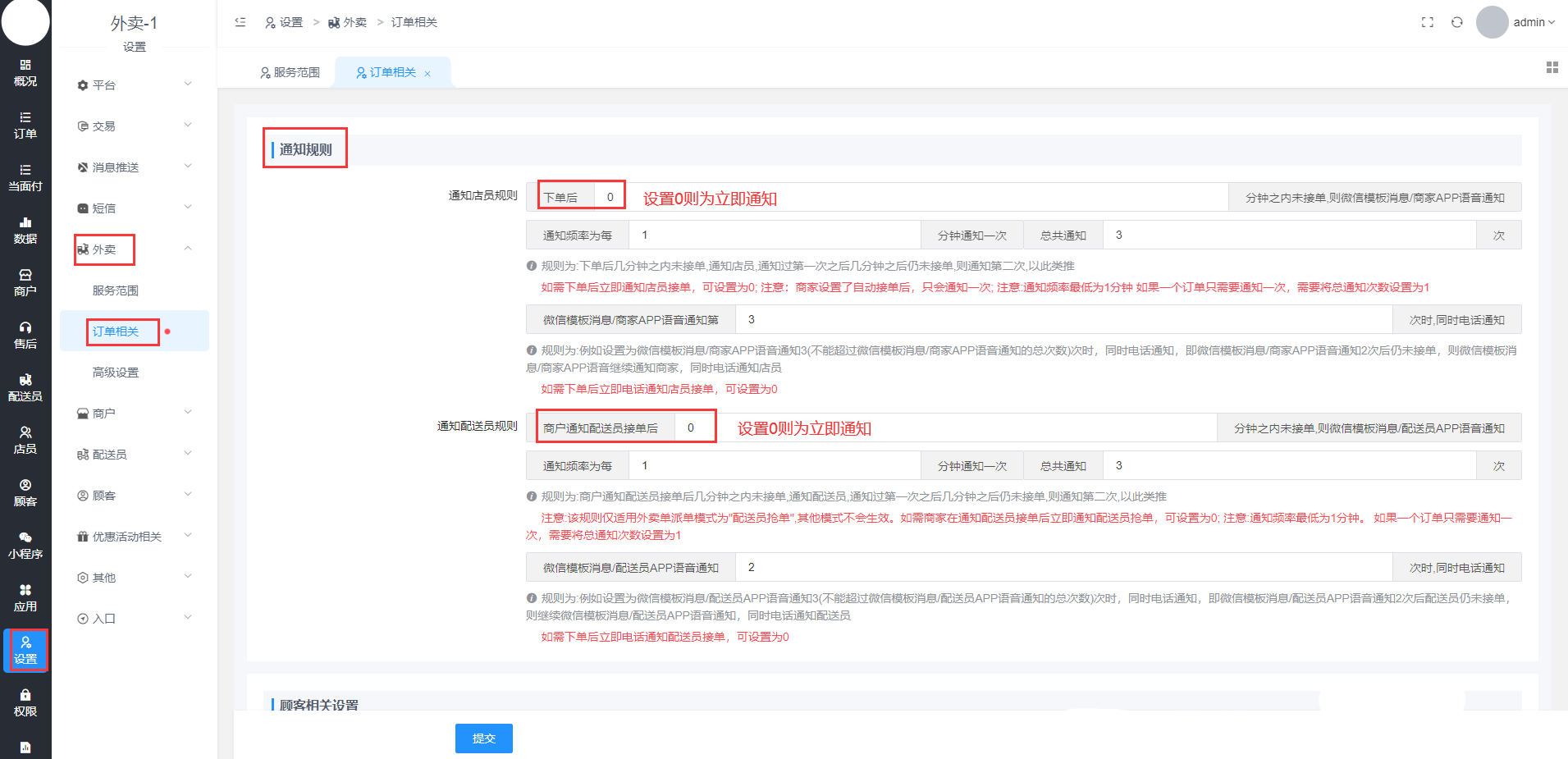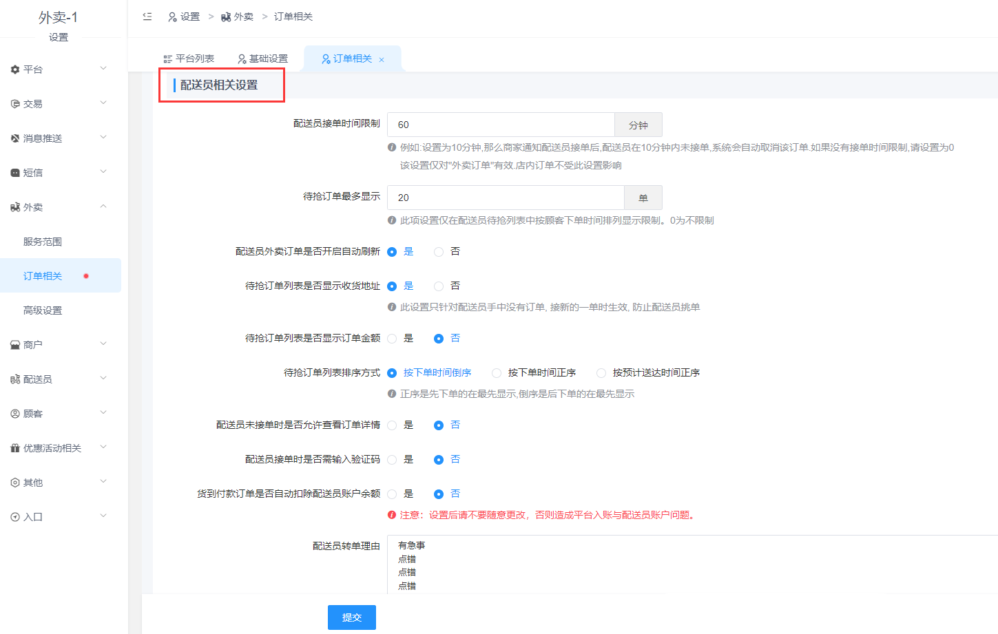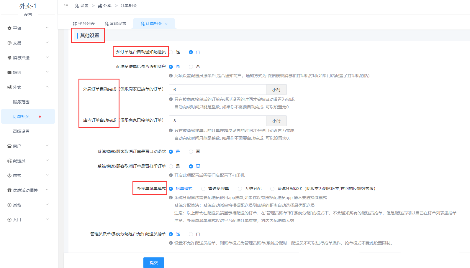 设置预定单是否自动通知配送员,订单自动完成时间,外卖单派单模式等