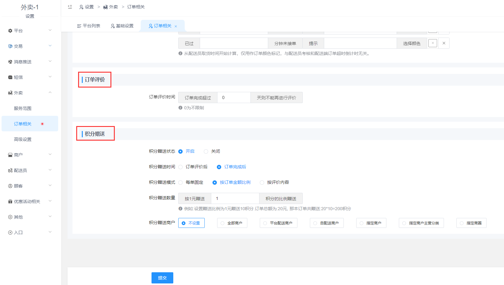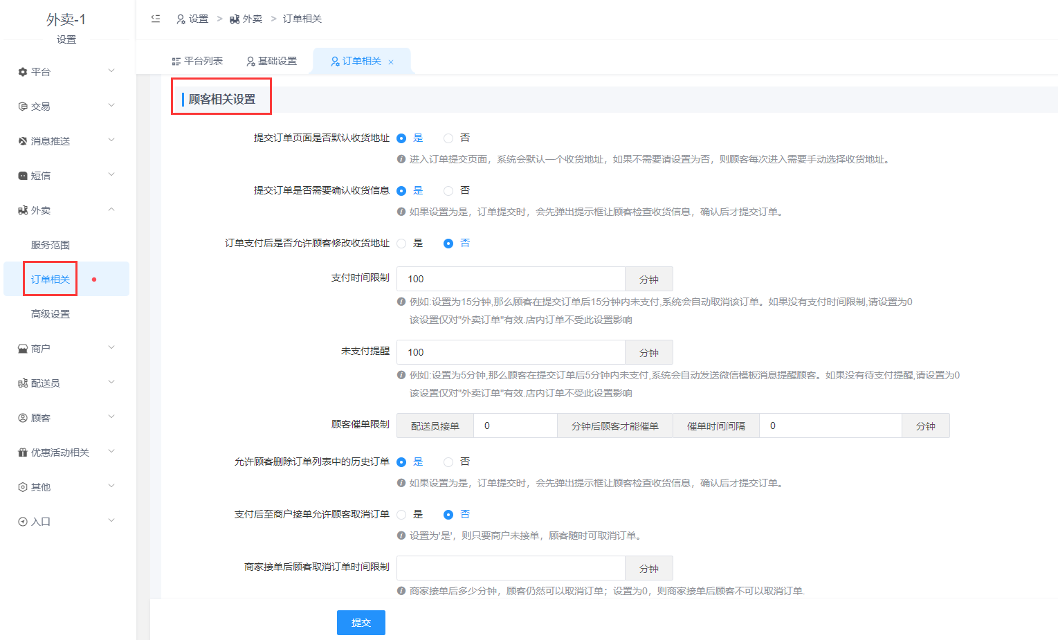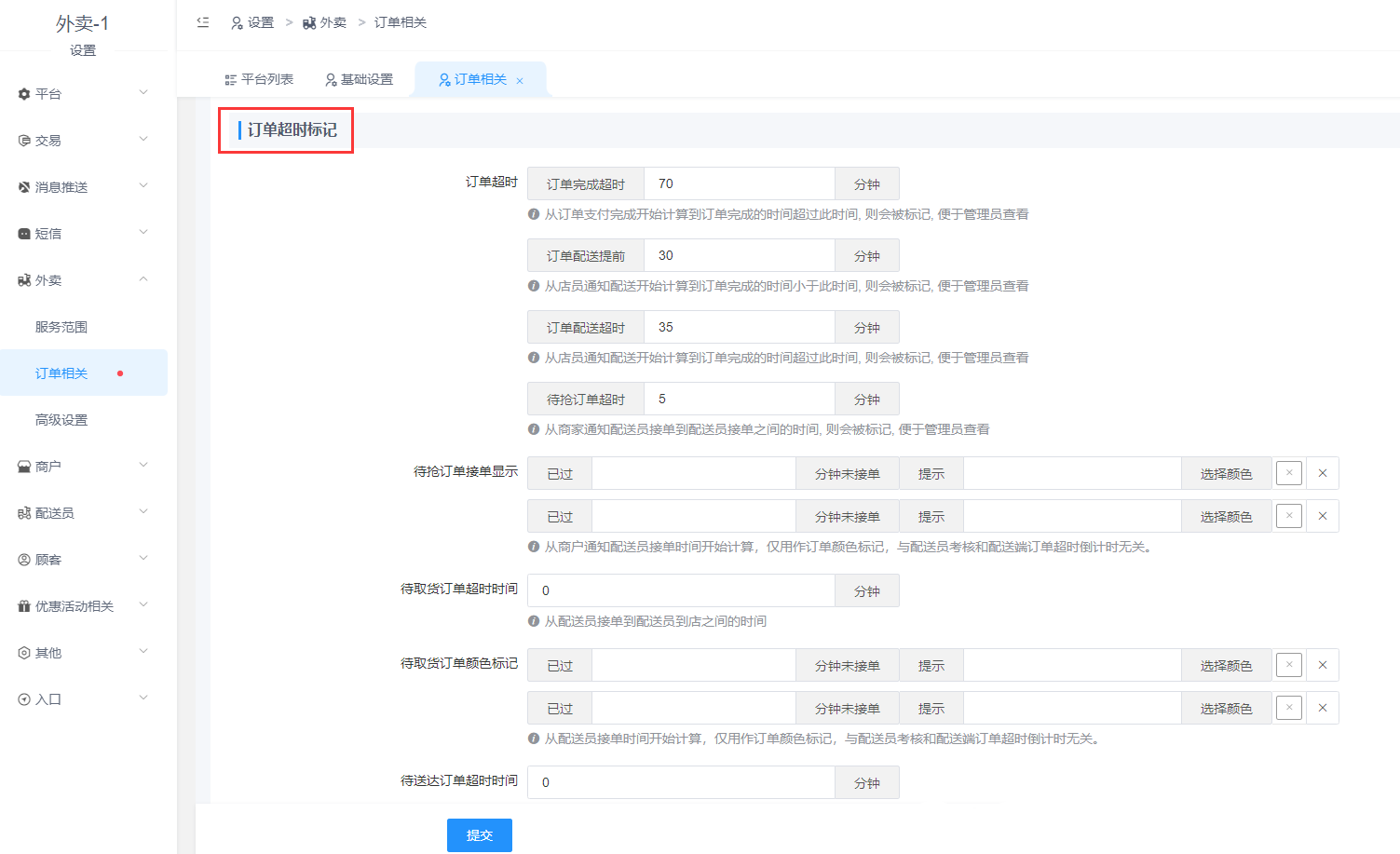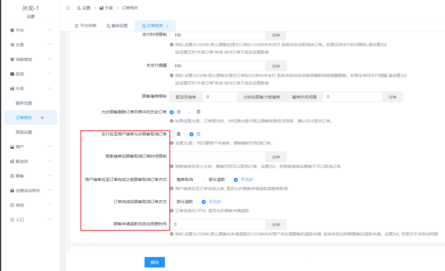 设置预定单是否自动通知配送员,订单自动完成时间,外卖单派单模式等