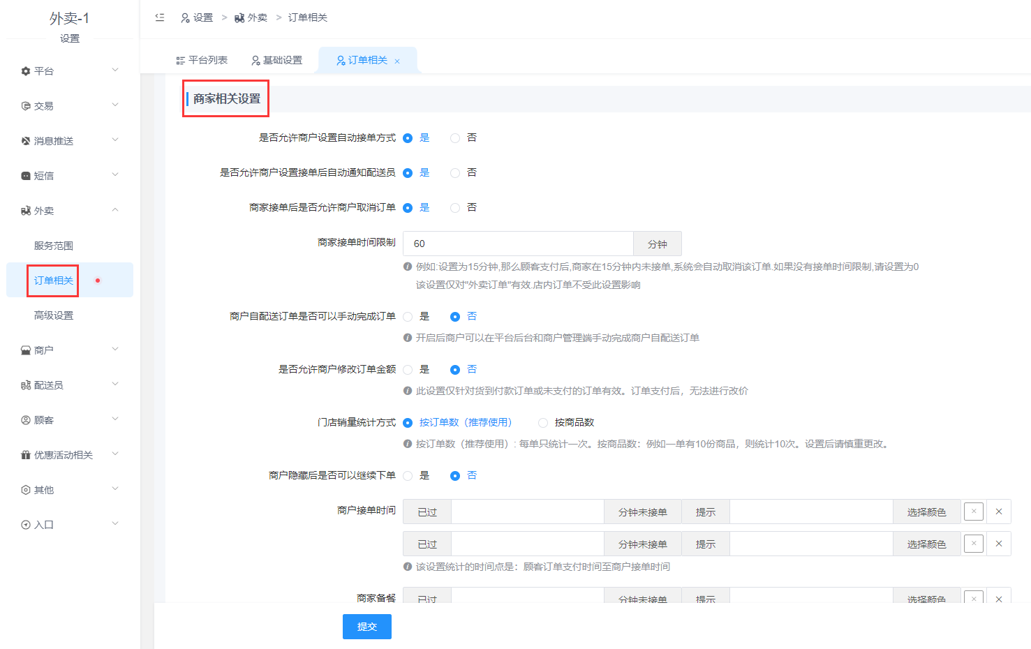 设置是否允许商家设置自动接单、自动通知配送员等,商户隐藏后是否可以继续下单。