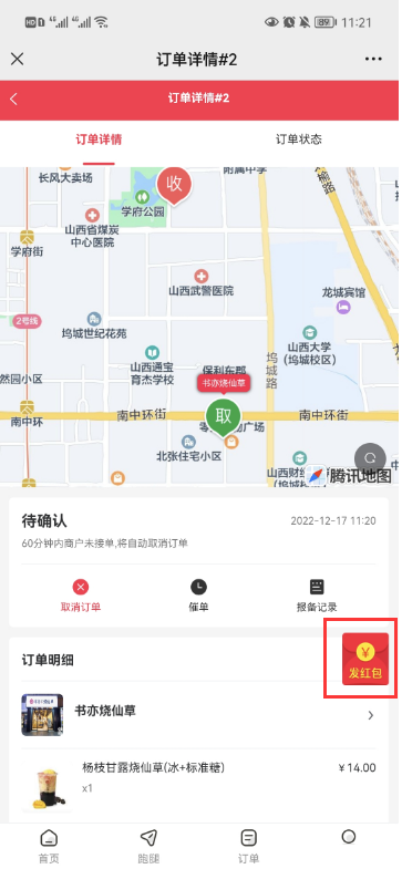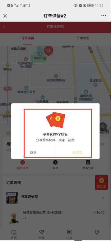 顾客订单详情里,点击发红包