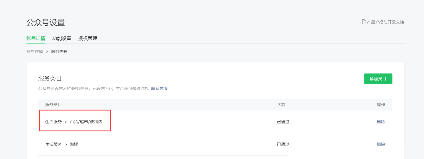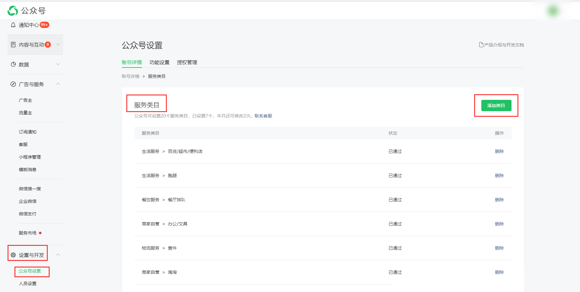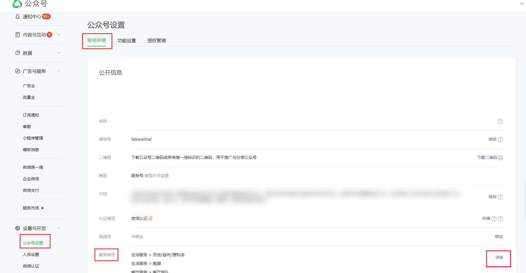 登录[微信公众号后台](https://mp.weixin.qq.com/),点击设置与开发-公众号设置-服务类目-详情