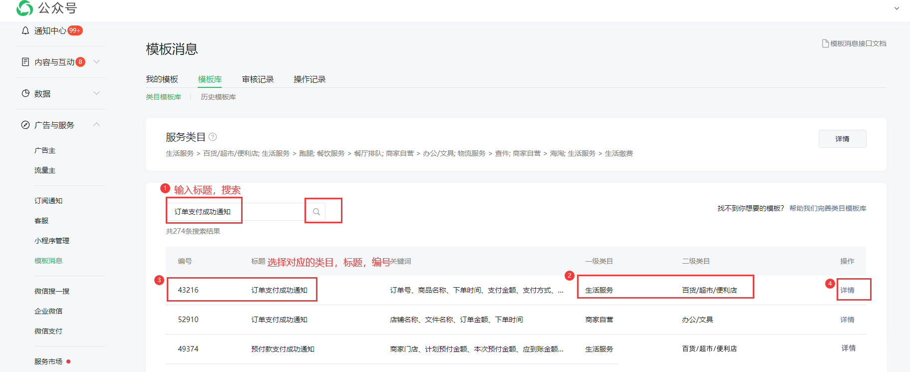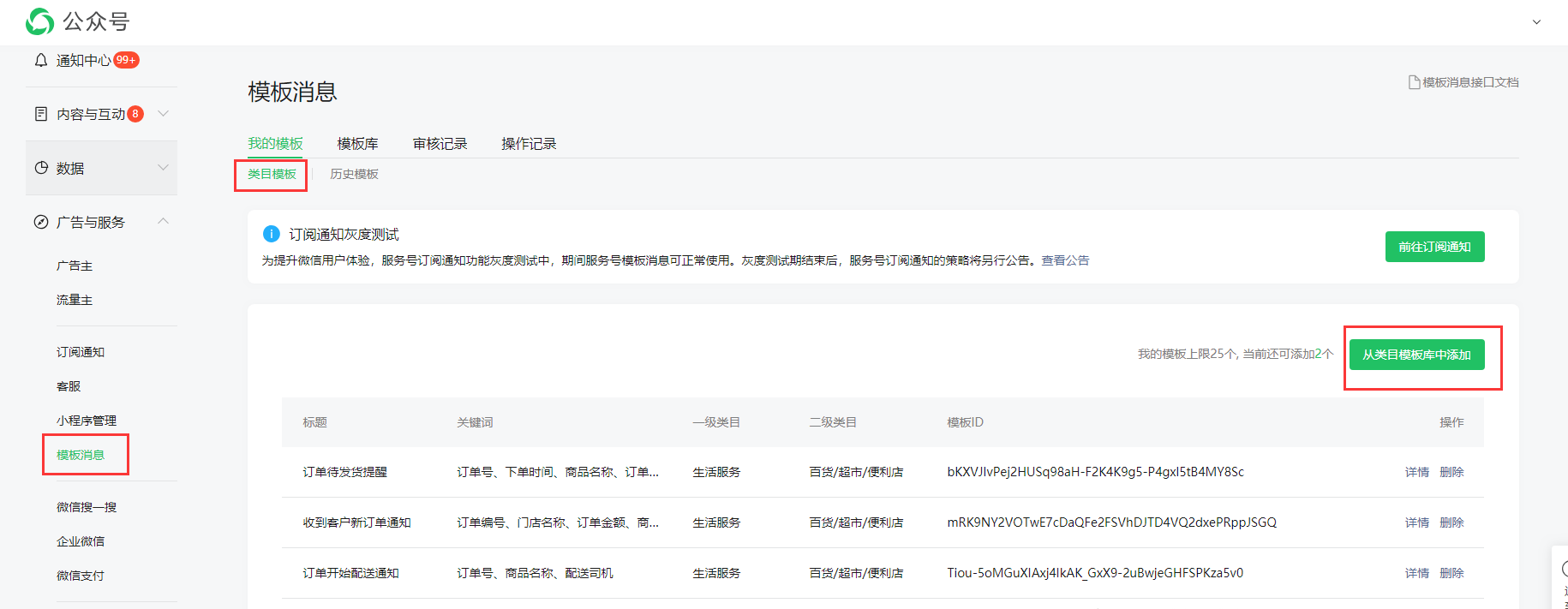 微信公众号后台,点击广告与服务-模板消息-类目模板-从类目模板库中添加