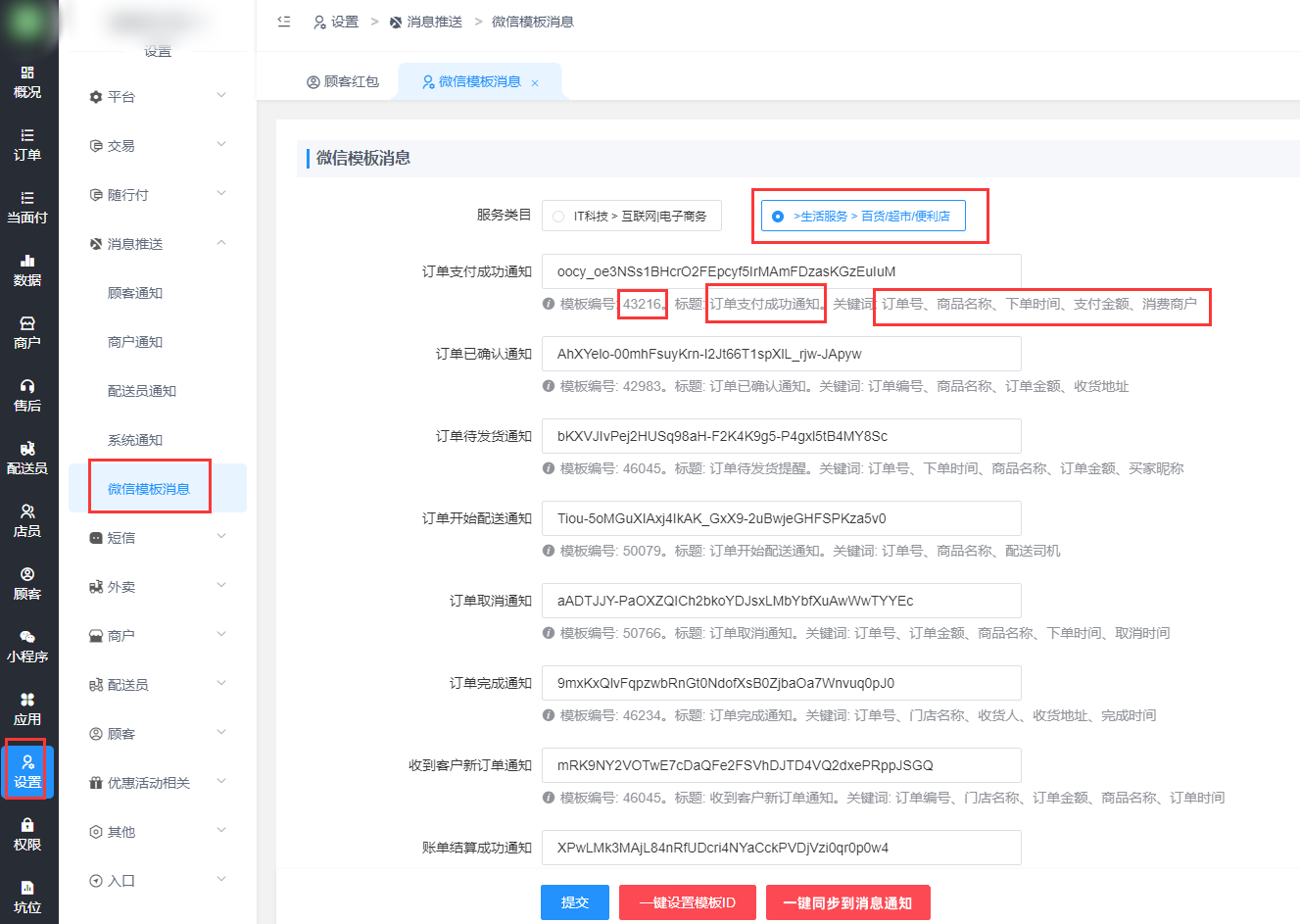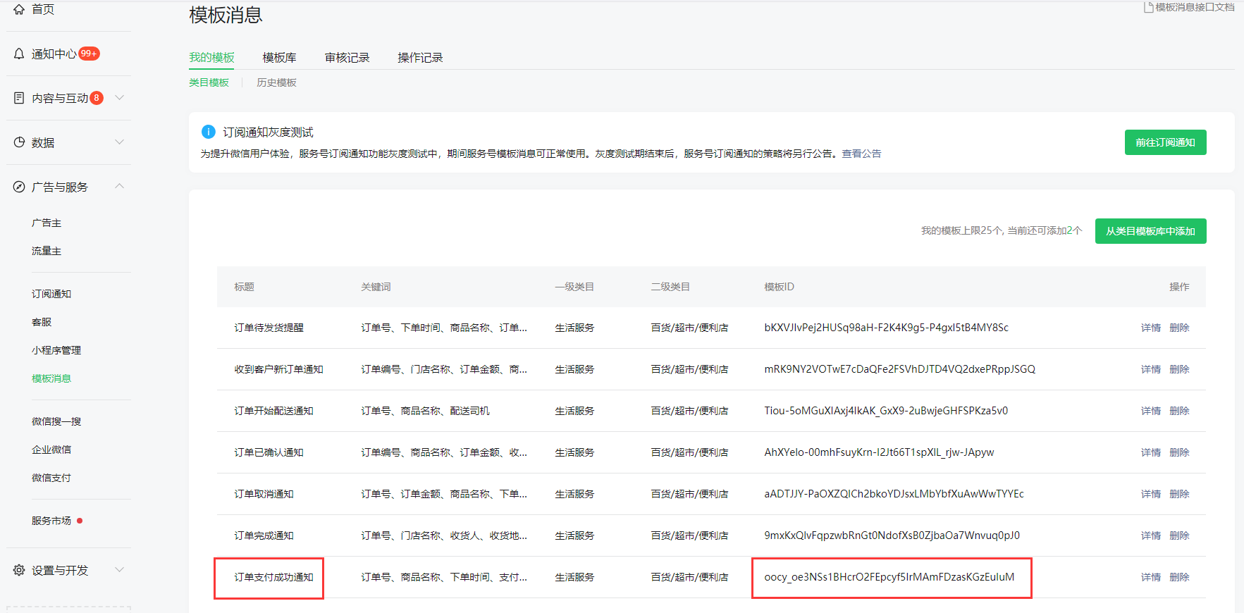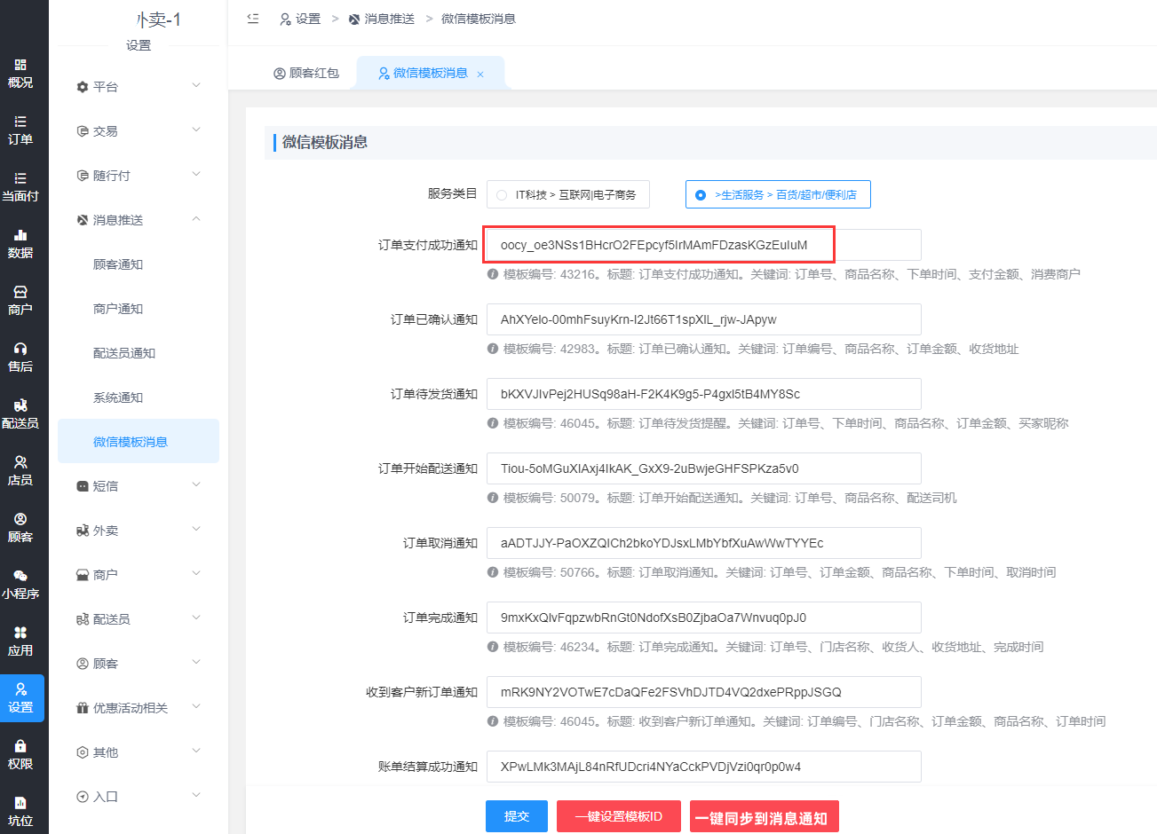 后台设置-消息推送-微信模板消息,查看模板消息信息,去公众号后台对应搜索添加