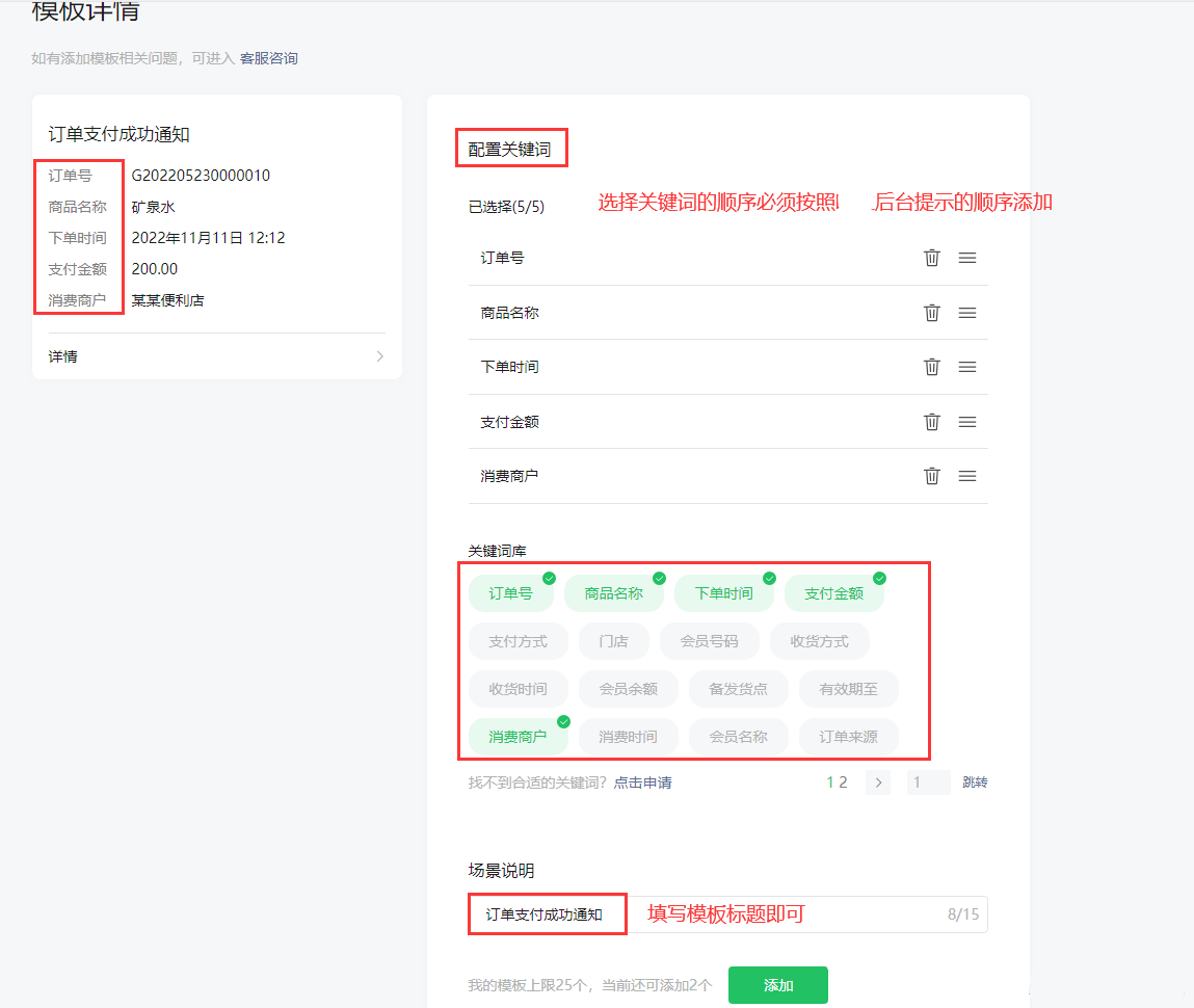 >[danger]注意:模板消息的类目、编号和关键词顺序必须和后台的提示一致