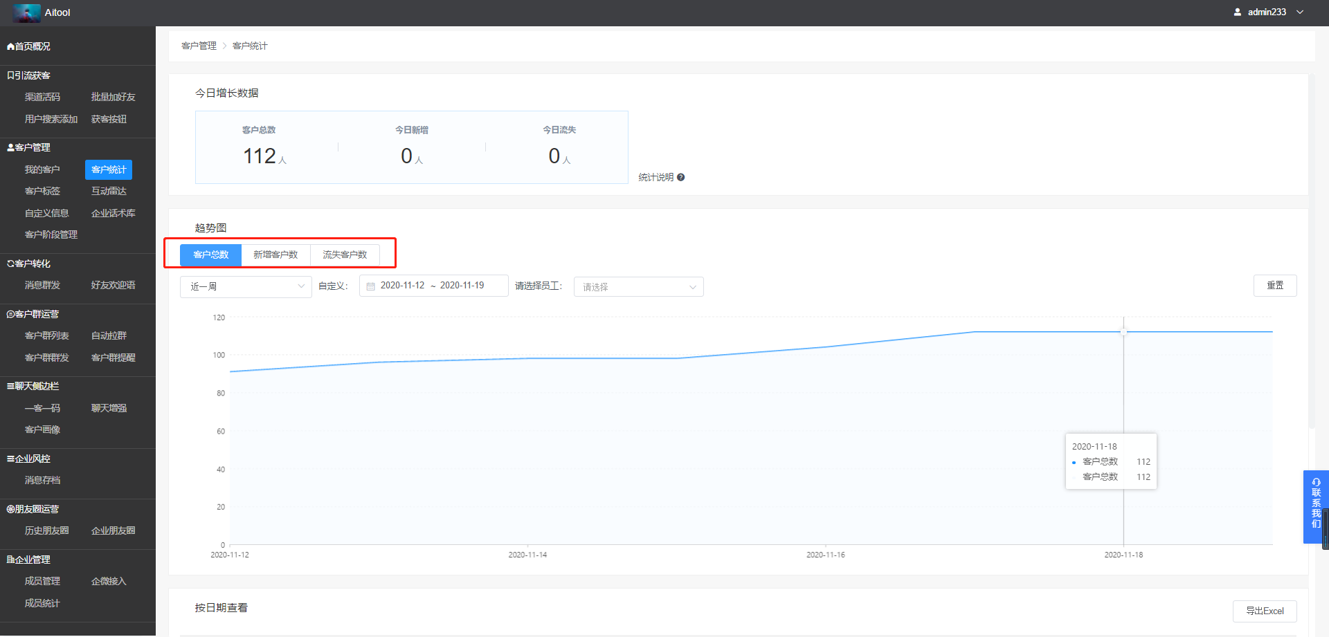 ## 客户管理 ### 客户统计 可查看企业今日企业客户总数、企业今日新增客户数、今日删除员工的客户数,还支持按照时间段、按照员工查看