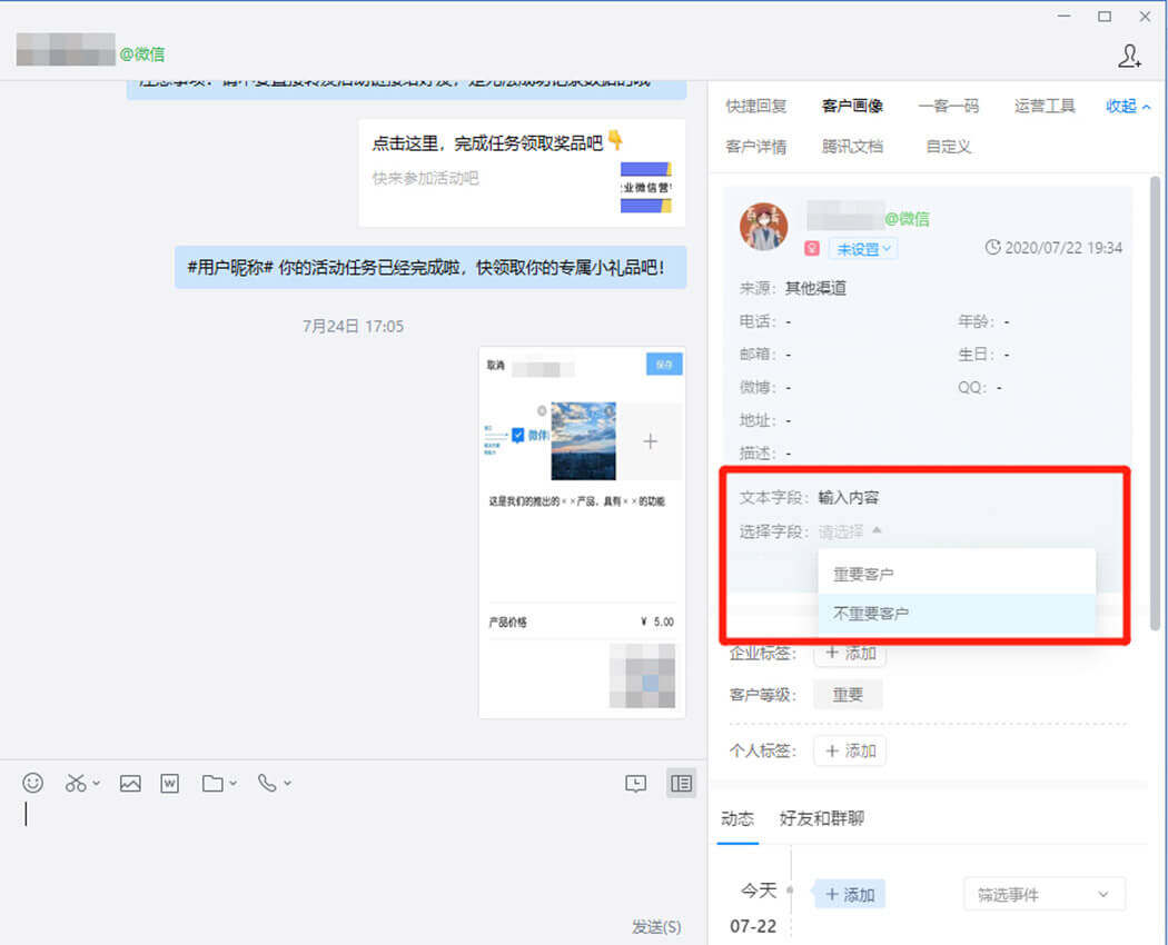 展示在聊天侧边栏客户画像中的信息,可以帮助员工了解客户,进行跟进,管理员可自行添加删减。
