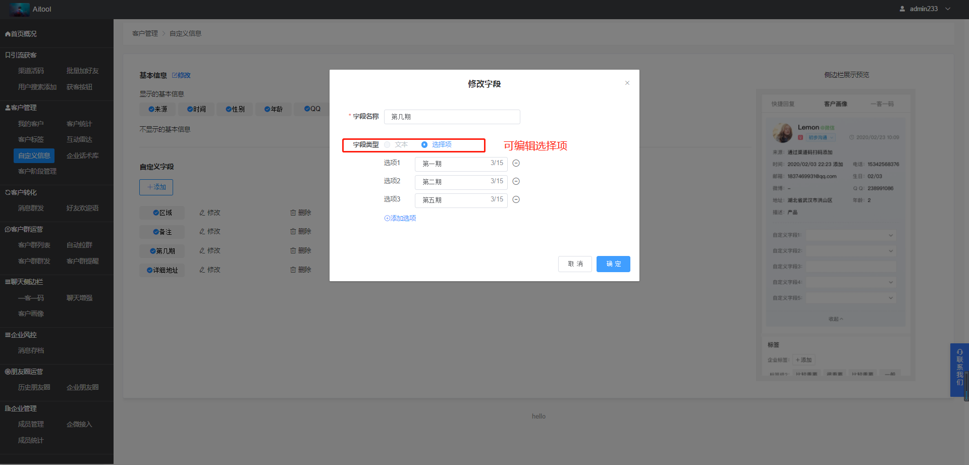 点击自定义字段下方的添加,管理员可以添加文本字段和选择字段。