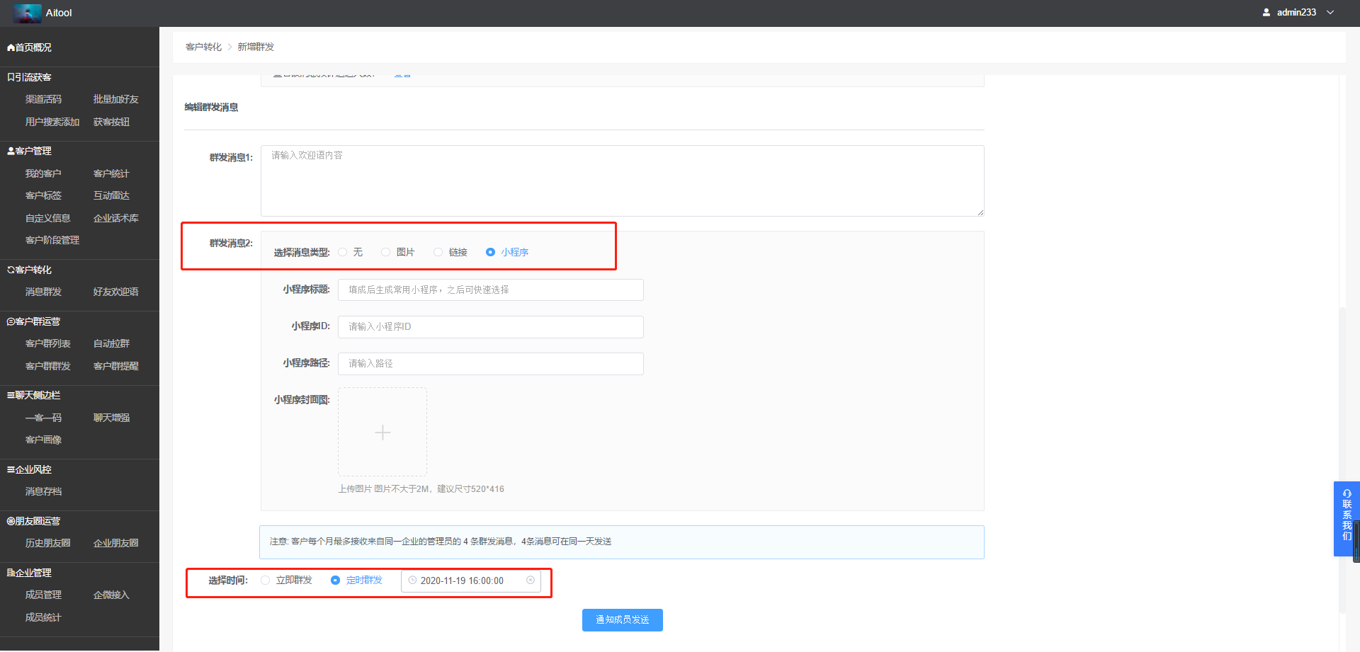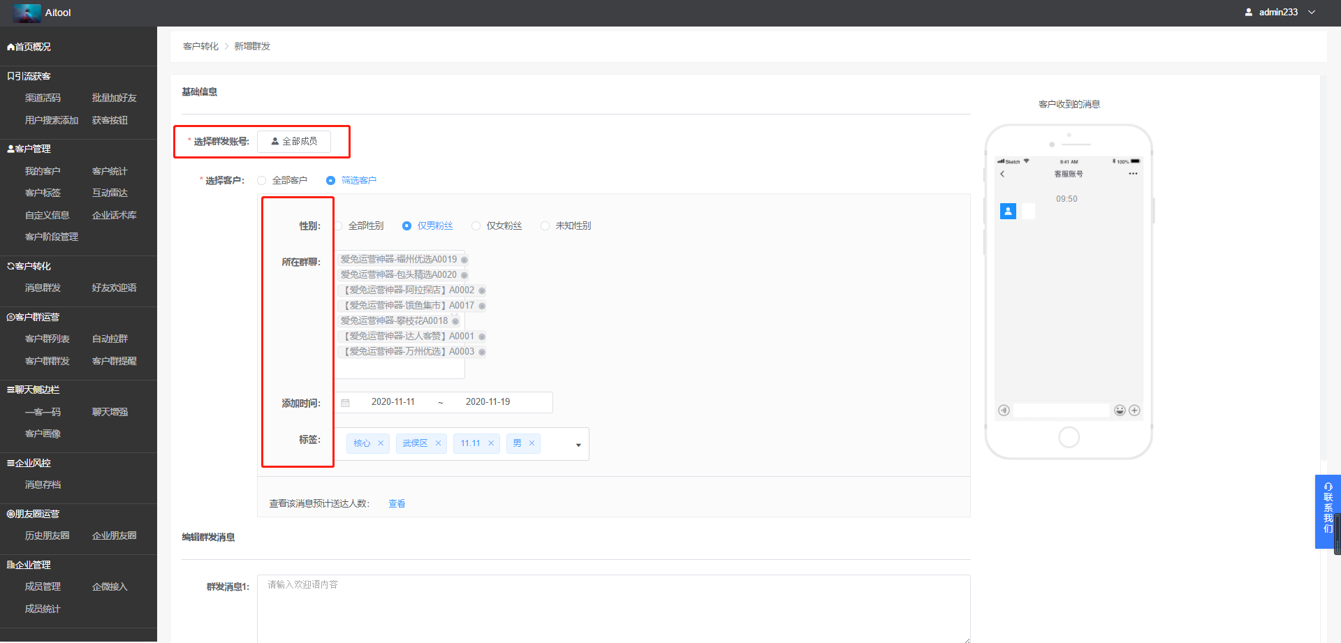 具有客户联系使用权限的成员,都可以使用群发助手给自己的客户发送消息;拥有AITool「管理员」及以上权限的成员可向普通员工的客户创建企业服务消息。