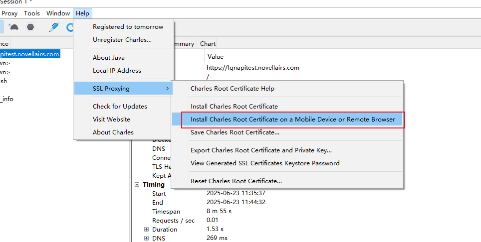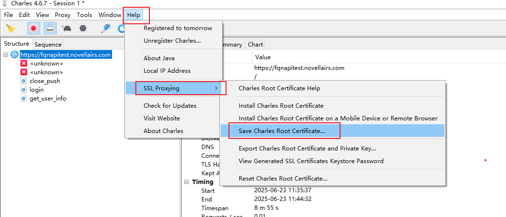 3:打开charles,保存SSL证书和代理信息获取;打开help->SSL proxying->save Charles Root Certificate,下载证书到指定文件夹(后面配置模拟器SSL证书要使用,pem格式(图1),文件名称自己命名,比如:ssl.pem),然后选择图2,找到要配置代理的地址和端口(图3)