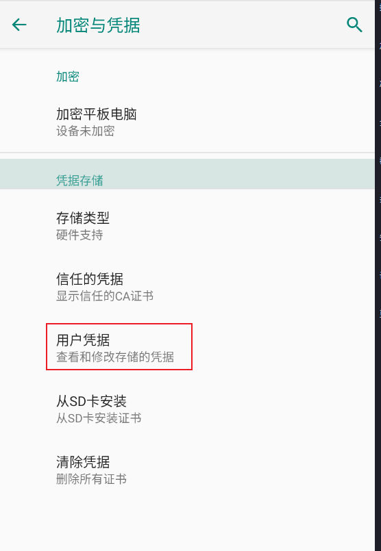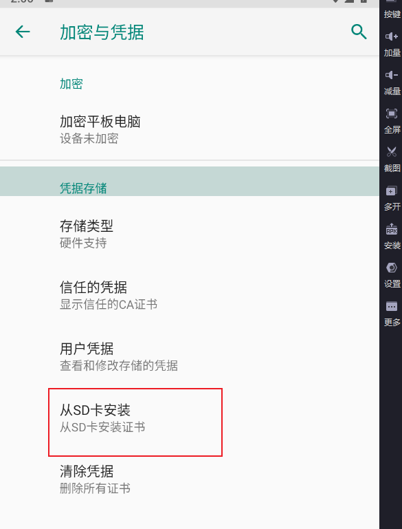 6:打开配置,搜索凭据,点击凭据存储,选择从SD卡安装(SSL证书文件所在的指定文件夹),选中安装即可
