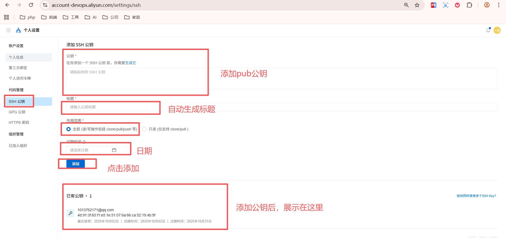 3. 找到git管理平台的ssh密钥中,將pub公钥复制上去,在任意位置,执行(上面的是公司阿里云云效的ssh,下面的是个人阿里云云效的ssh),以下两个命令: