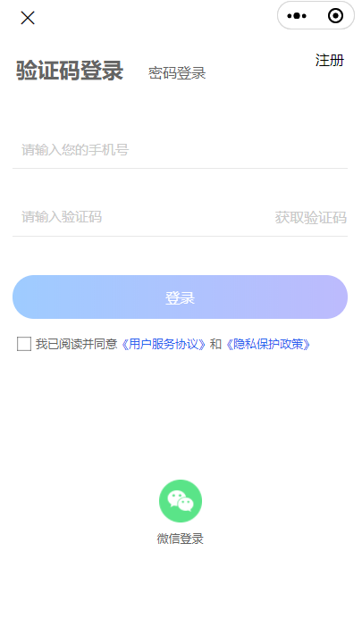 登录分为验证码登录, 密码登录, 微信登录 验证码默认是123456, 想接入验证码可以在后台设置中配置, 但前题是接入对应服务