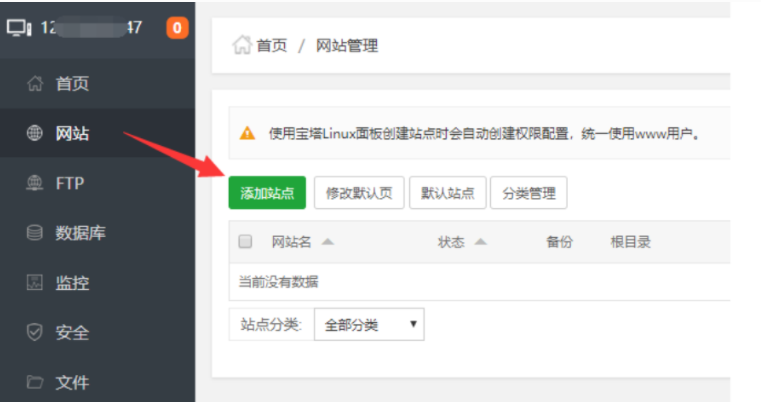 2.添加站点。点击左侧菜单**网站→添加站点**
