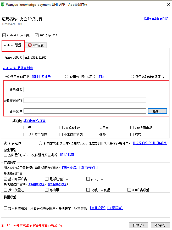 弹出打包窗口, 填入红框内3个信息, 安卓证书生成方法可以咨询安卓开发. 然后点击下方打包即可.