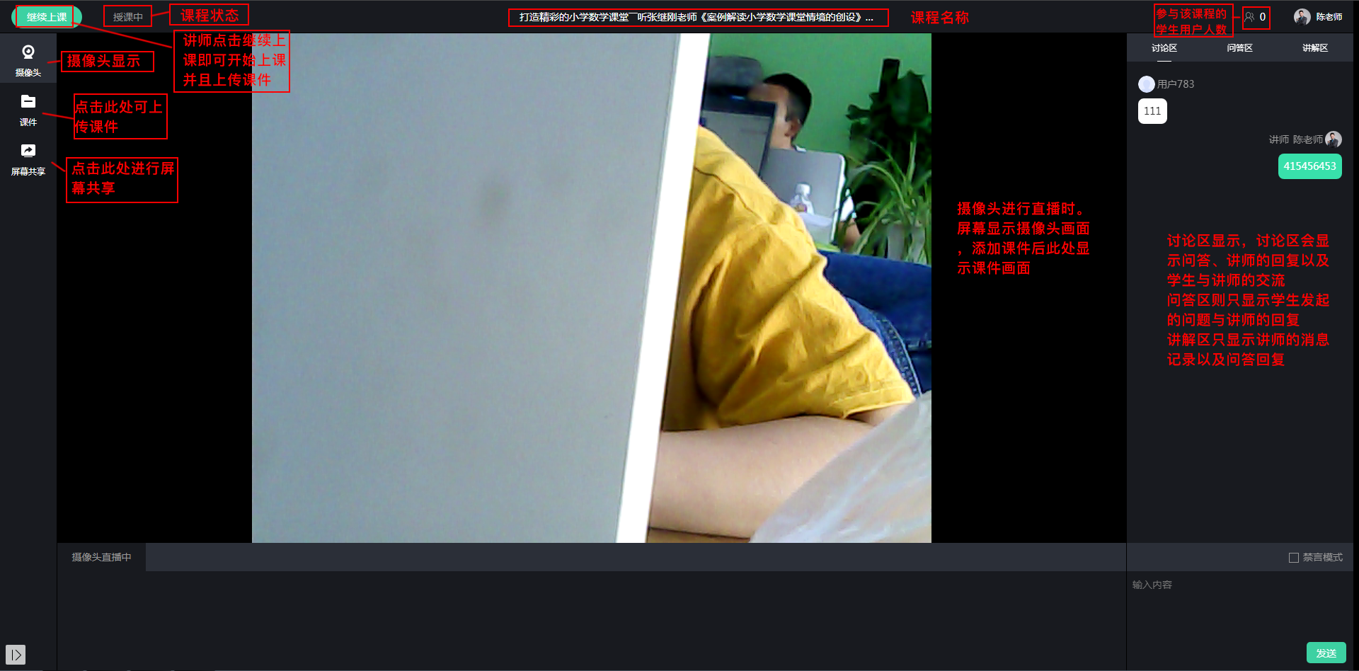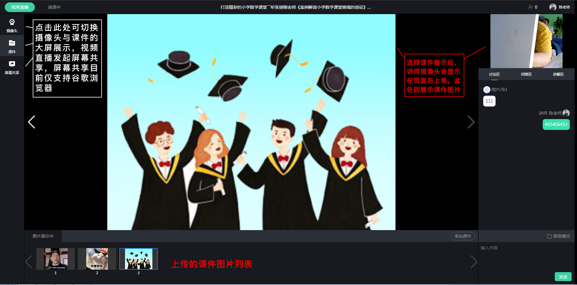 视频大班课讲师可以在课堂内开启视频摄像头直播,且仅可以自行上传ppt图片课件,无法上传音频/视频课件;