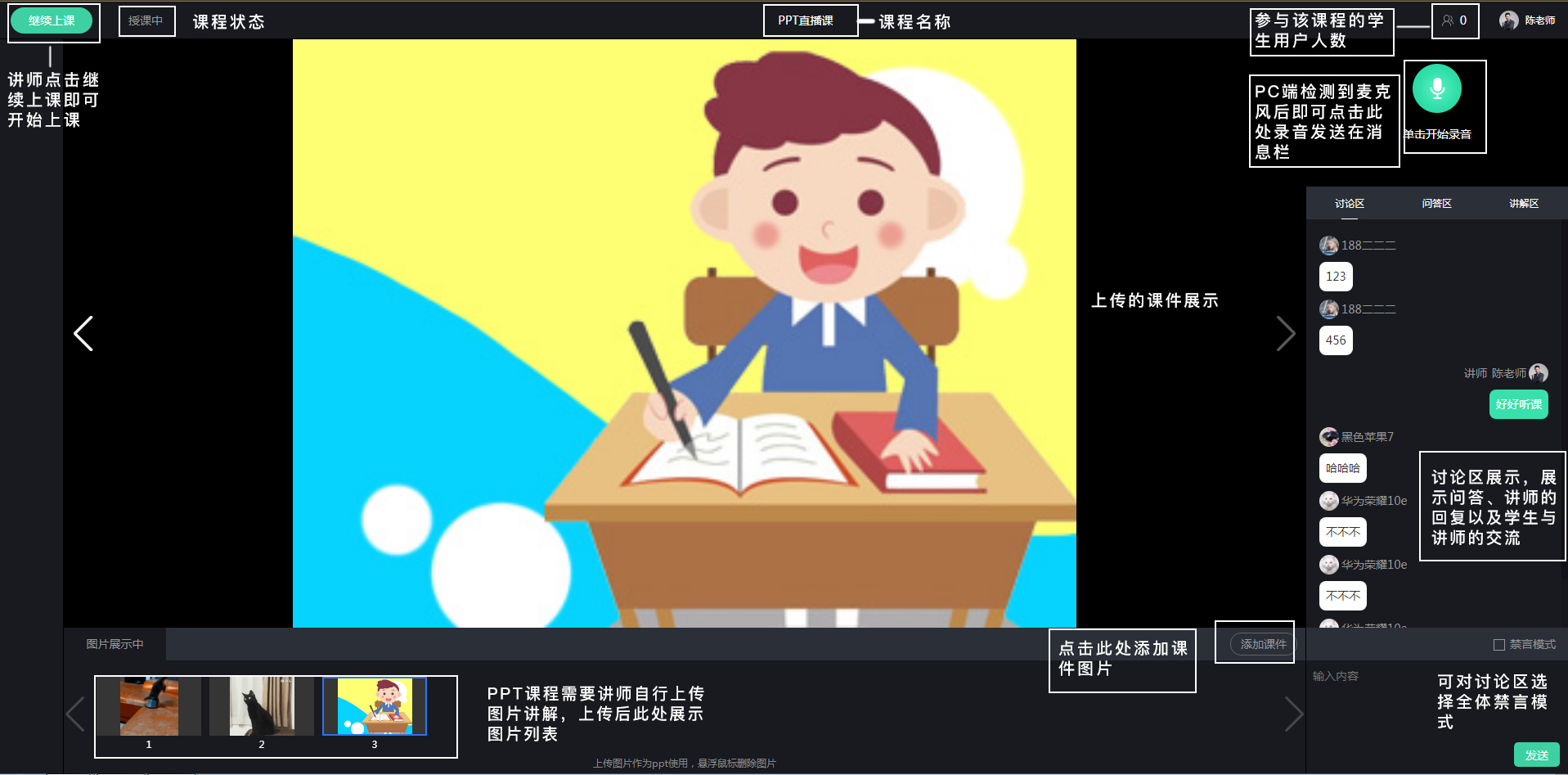 直播课堂内展示的是后台在知识管理-大班课列表内添加的课程,语音大班课讲师可点进课程内给学生进行问题回复及讲解,视频大班课讲师可开启摄像头并上传课件进行授课