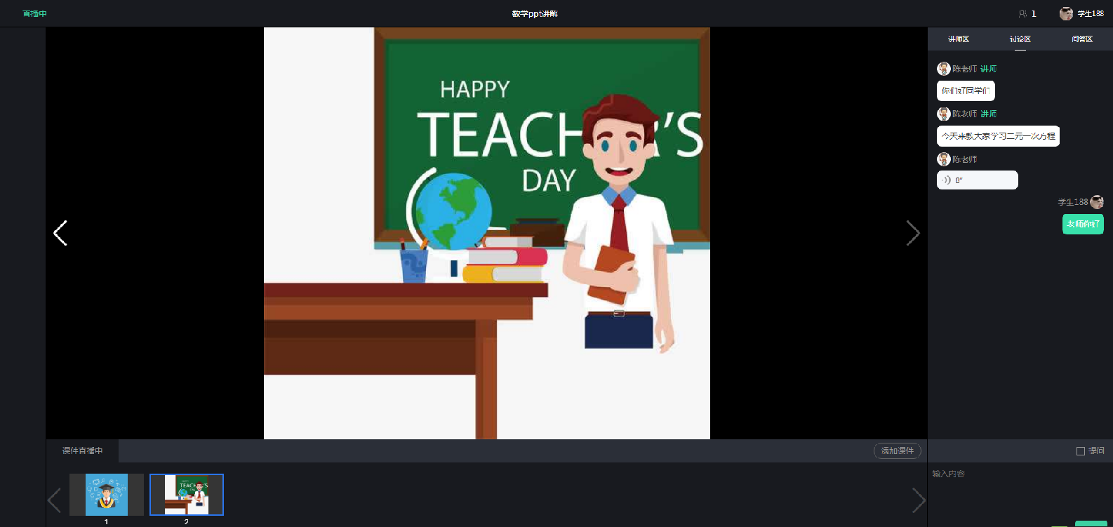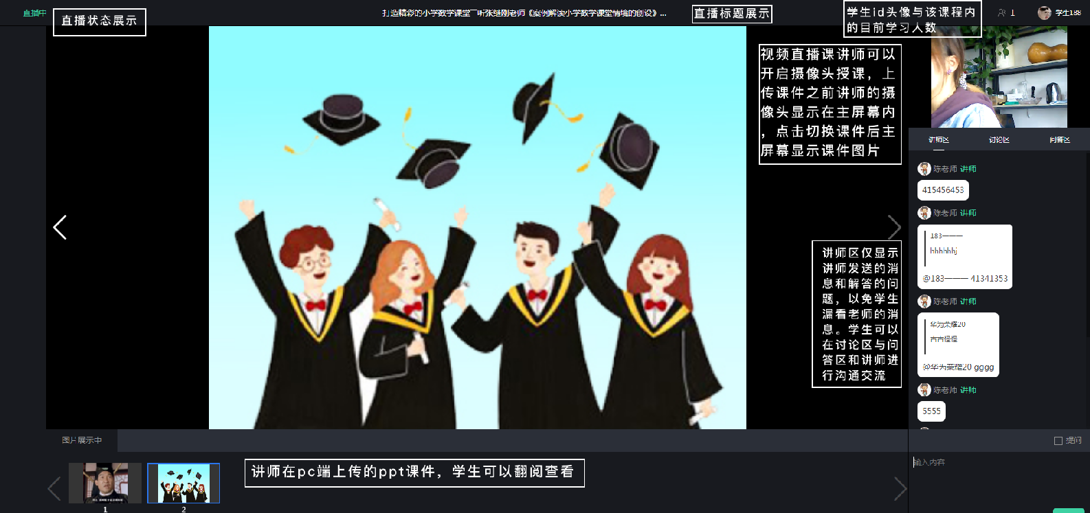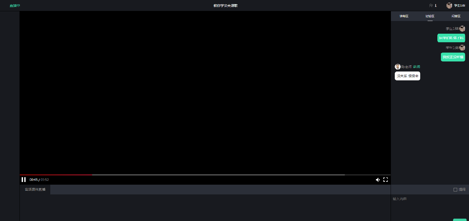 音视频课程则是由后台上传相关课件后,讲师在直播间只负责在讨论区与学生进行沟通交流