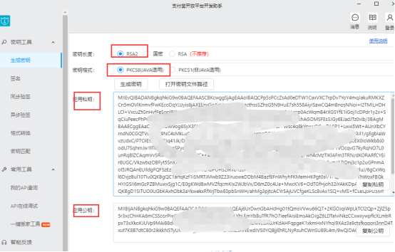 应用的 密钥对 请通过 支付宝开放平台开发助手 生成 注意选项配置