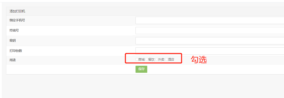 ### 6、点击上图所示的终端管理,添加终端,终端的参数再打印机的背面,保存