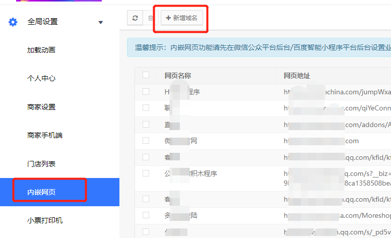 2.验证通过后在我们的小程序管理后台全局设置——内嵌网页,添加域名即可(网页地址前缀必须为https)