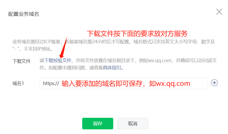 点击添加业务域名,输入域名后会提示你下载一个效验文件,将下载效验文件放入你的服务器中,方可添加成功
