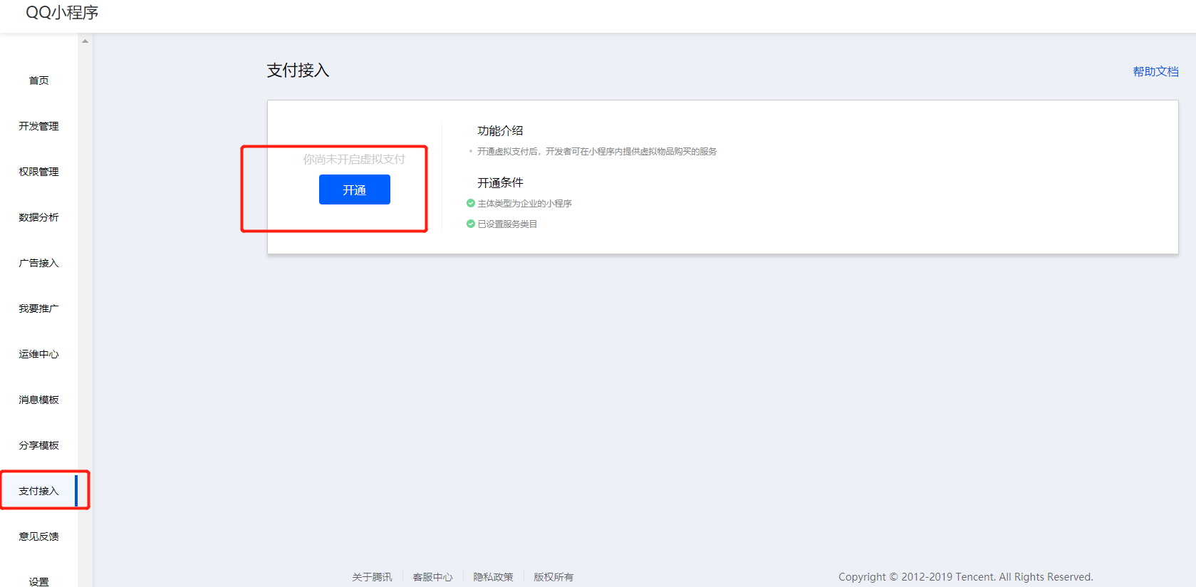 一:在QQ小程序官方后台,点击支付宝接入,开通虚拟支付