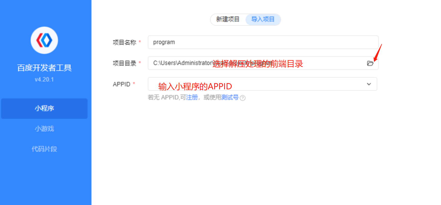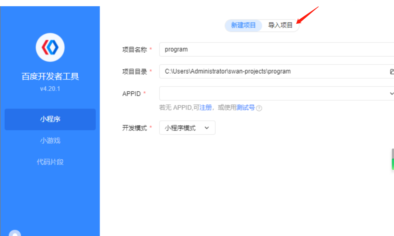 **3.****安装好百度开发者工具后,打开百度开发者工具,然后在百度开发者工具里面选择导入项目,不要选择新建,选择打开小程序文件夹**