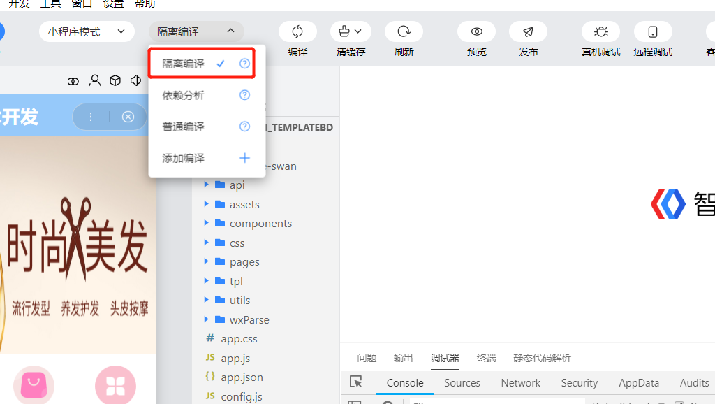 打开开发者工具后,将小程序模式改成隔离编译