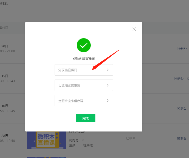 5.创建好直播间后,点击分享二维码,可以将直播间二维码分享到朋友圈或者好友,邀请进入观看