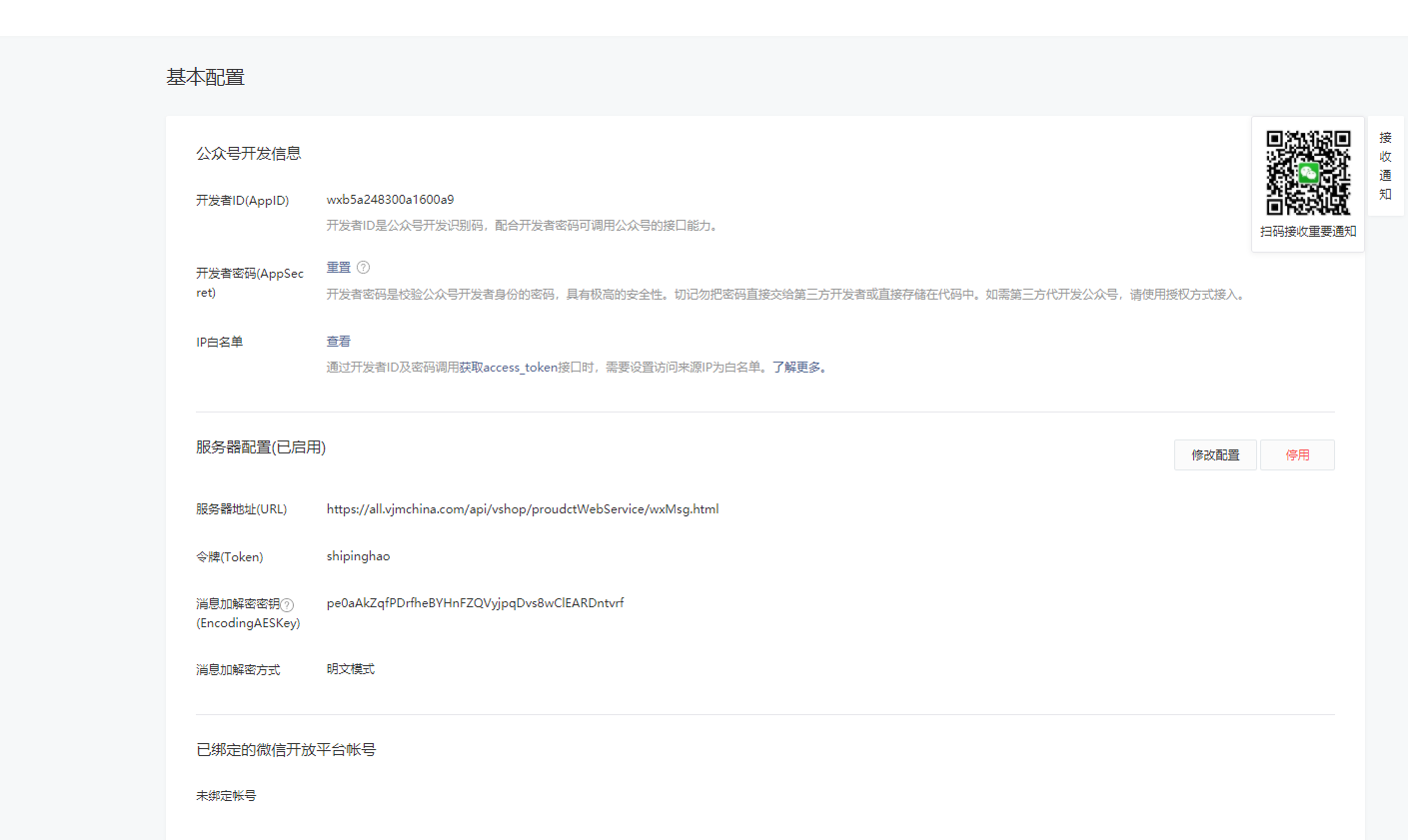 消息加解密密钥(EncodingAESKey):pe0aAkZqfPDrfheBYHnFZQVyjpqDvs8wClEARDntvrf