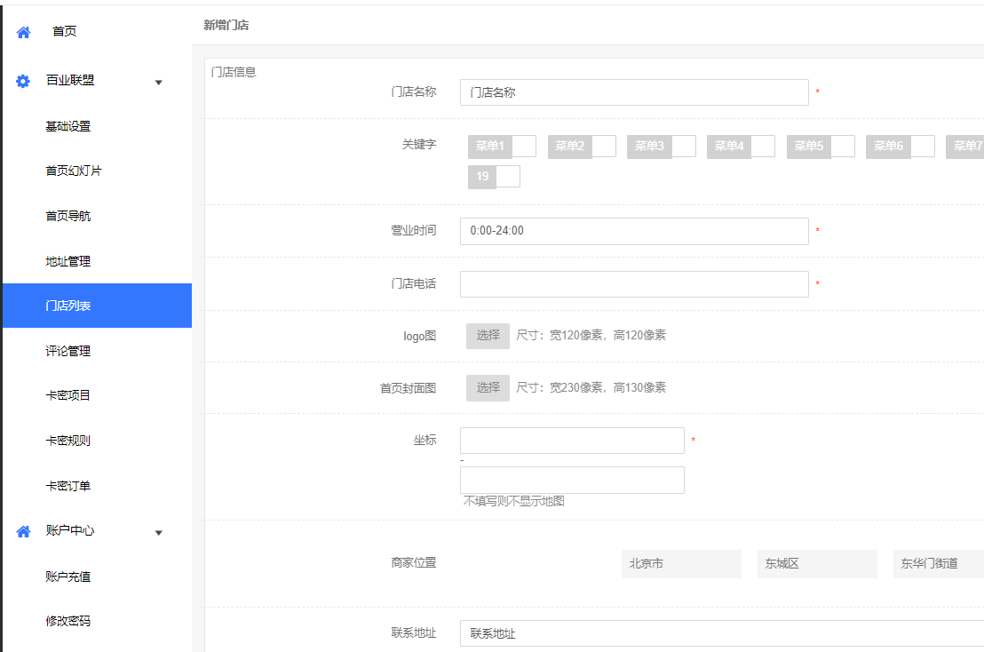添加门店,设置门店,可以设置门店关键词,关键词是首页导航点击能检索到门店的词