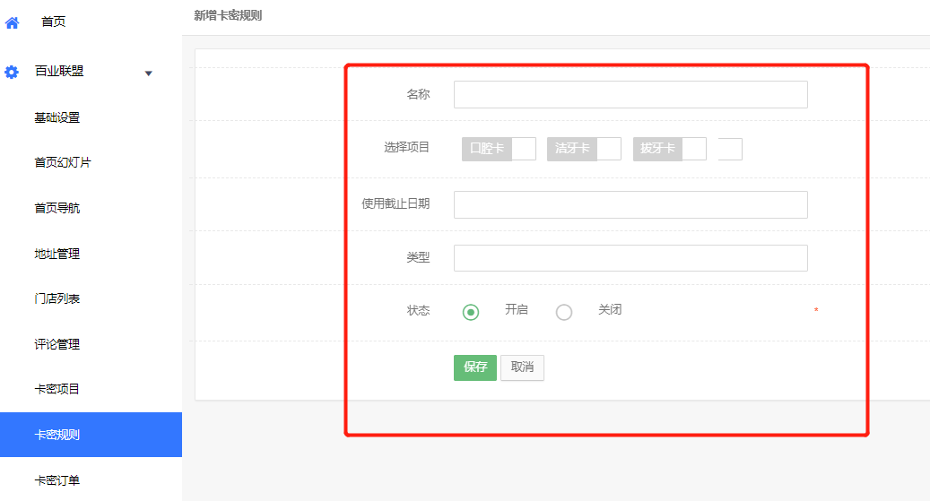 选中卡密核销的项目,项目可以多选,设置卡密使用截止日期,类目为备注可以填也可以不填