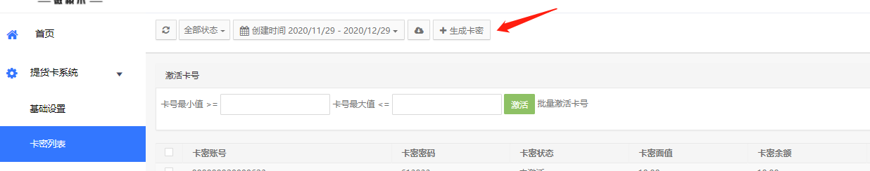 1。卡密列表,生成卡密和导出卡密,导出的卡密印刷到实体卡上销售