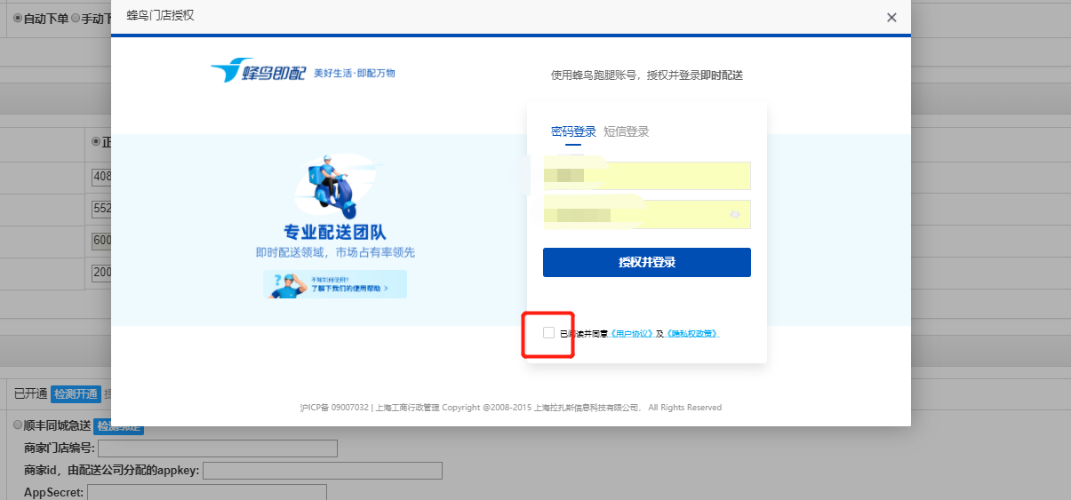 输入蜂鸟账户密码授权