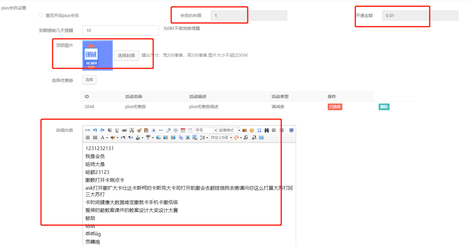 设置开通价格,和有效期,和开通页面的介绍顶部图片和会员功能介绍