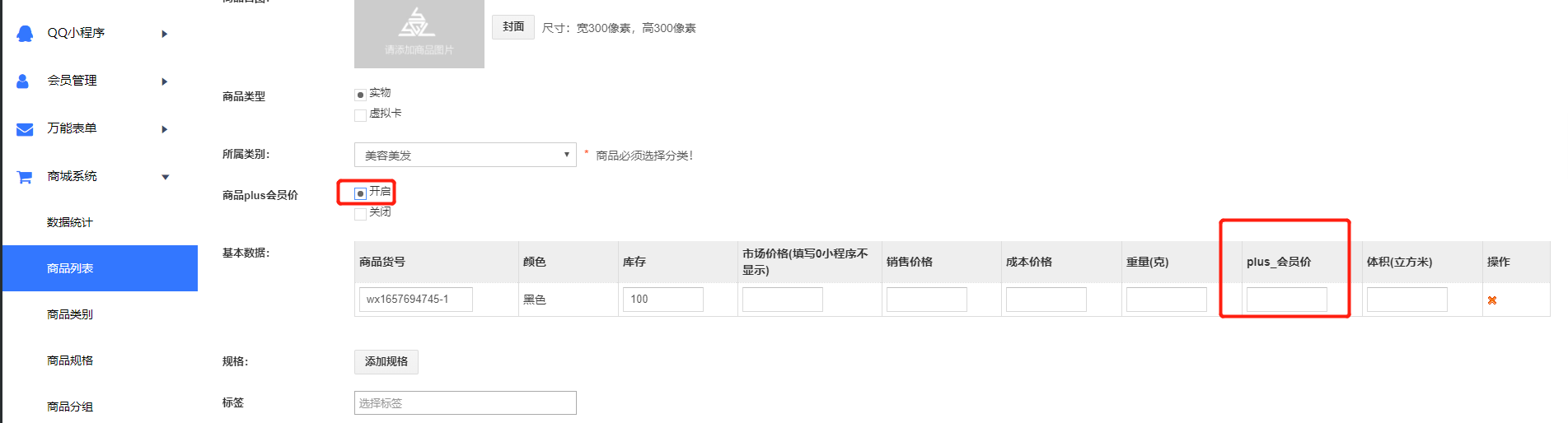 3.plus价格设置方法(注意:添加PLUS会员价格的时候,需要把市场价格写0,要不然小程序上面会显示好几个价格)