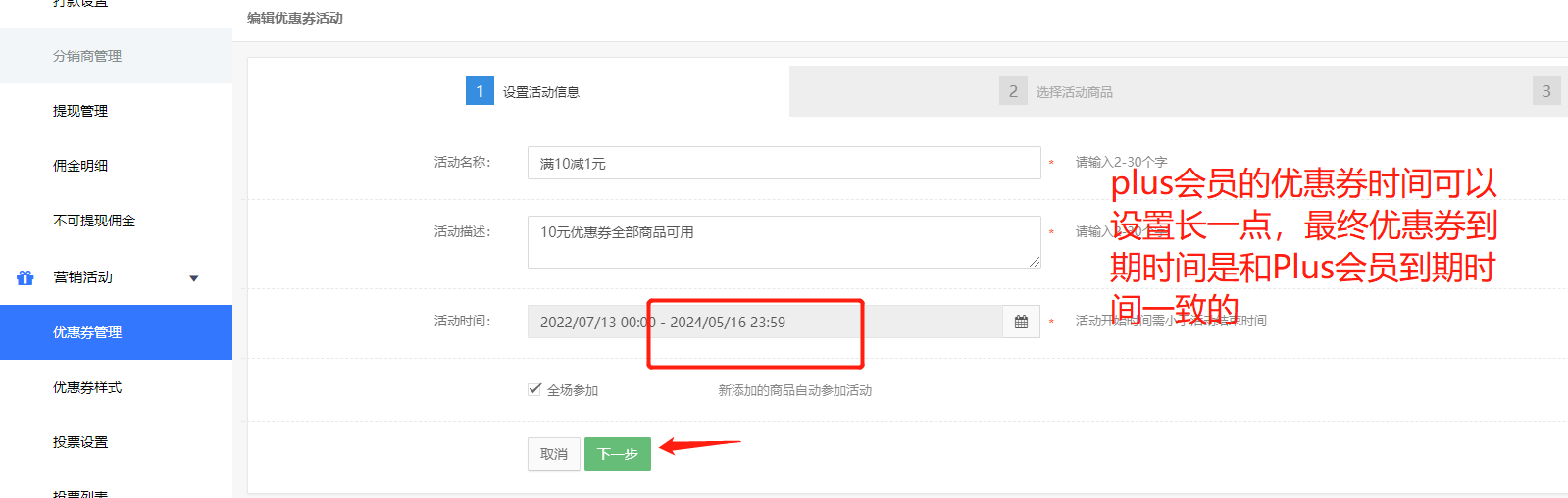 (注:时间可以设置长一点,优惠券时间到期时和他PLUS会员到期时间一致的)