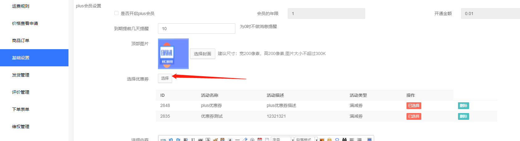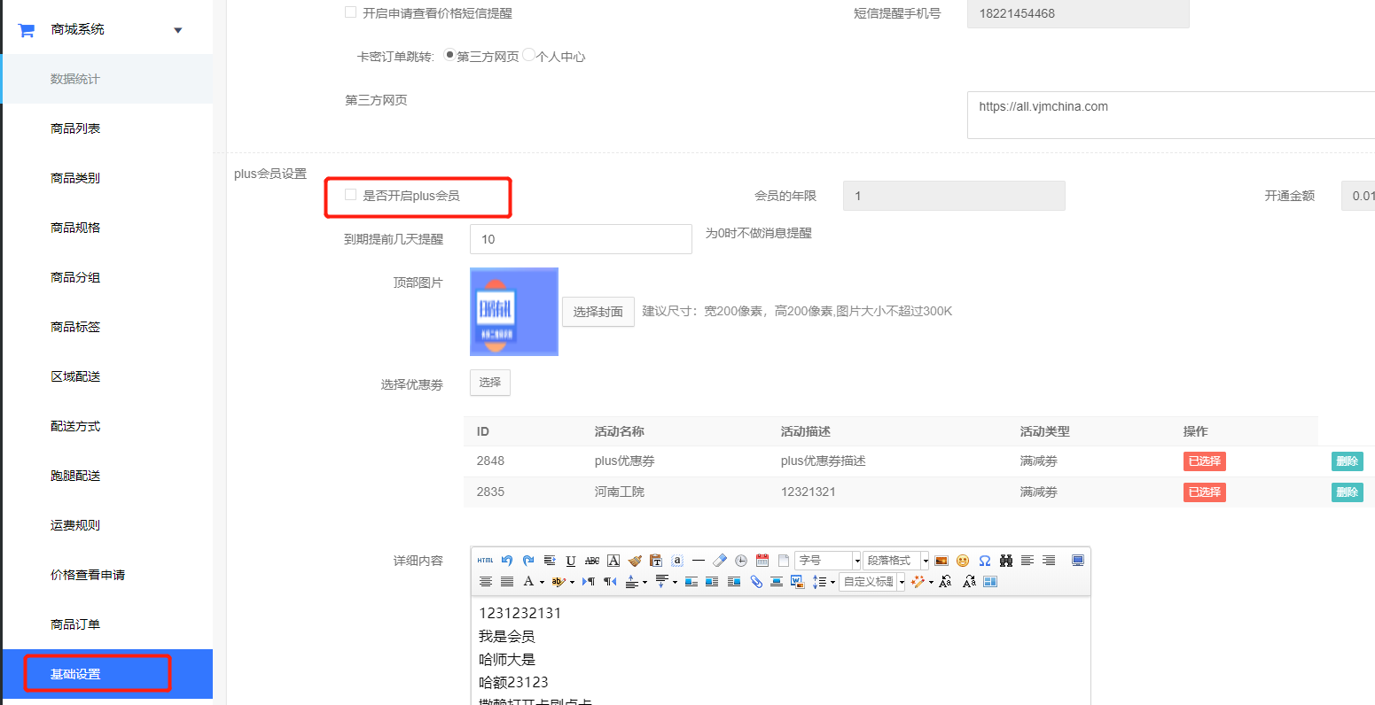 1.配置方法,商城系统——基础设置开启PLUS会员