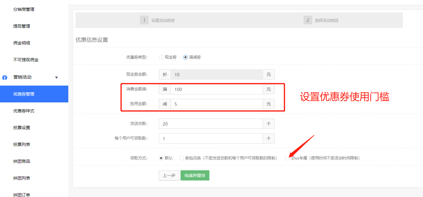 设置使用门槛然后勾选plus优惠券,保存即可