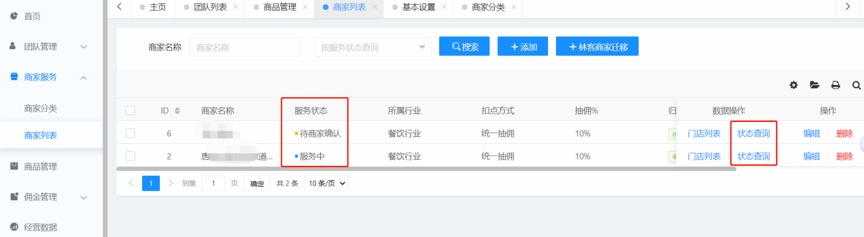 商家添加完成后系统会自动向商家发送签约进件通知,商家服务状态可在列表旁点击状态查询按钮更新服务状态,如未主动点击状态查询,系统默认一天会自动更新一次,商家服务状态变更为服务中即为添加完成