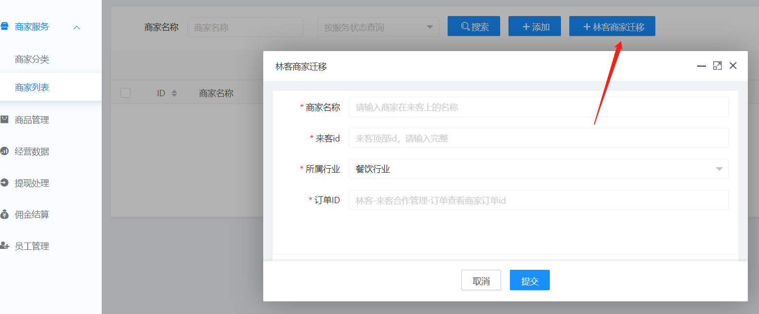 迁移需要输入商家的订单 id,需在林客后台查看: 合作管理订单管理 查找对应商家的订单号,订单号即为订单id
