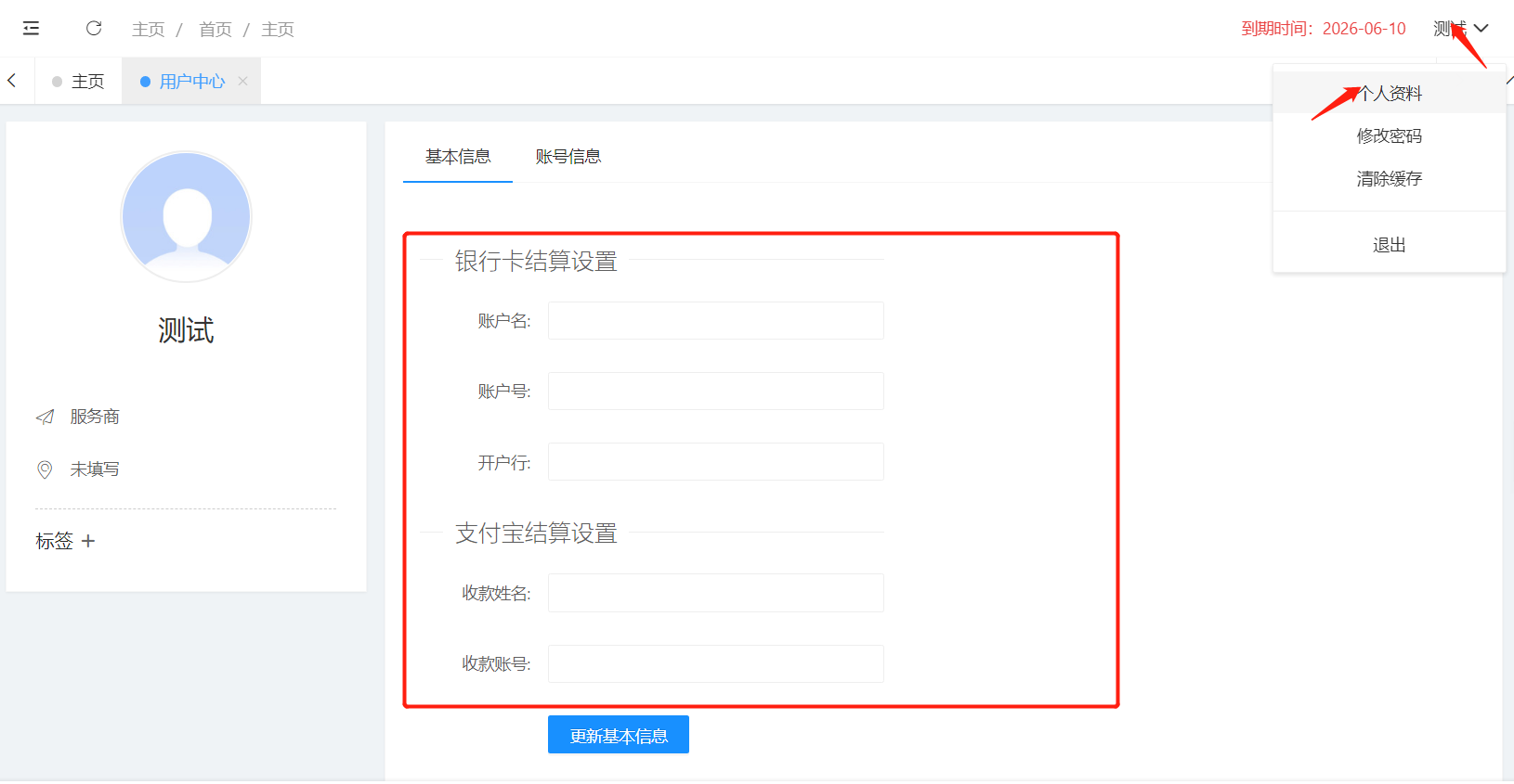 运营商申请提现需要先设置提现账户  设置完成,在 佣金结算· 提现申请 即可查看金数据以及提现信息
