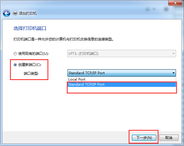 点击添加本地打印机,进入端口选择界面,选择创建新端口,端口类型为Standard TCP/IP port